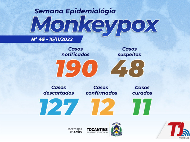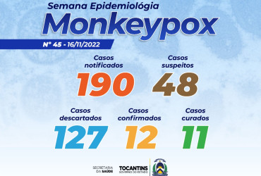 Nesta quarta-feira, 16, a Secretaria de Estado da Saúde (SES-TO) divulgou a atualização dos dados da Monkeypox no Tocantins. Abaixo está o levantamento do Centro de Informações Estratégicas de Vigilância em Saúde (CIEVS-TO) até 16 de novembro de 2022: