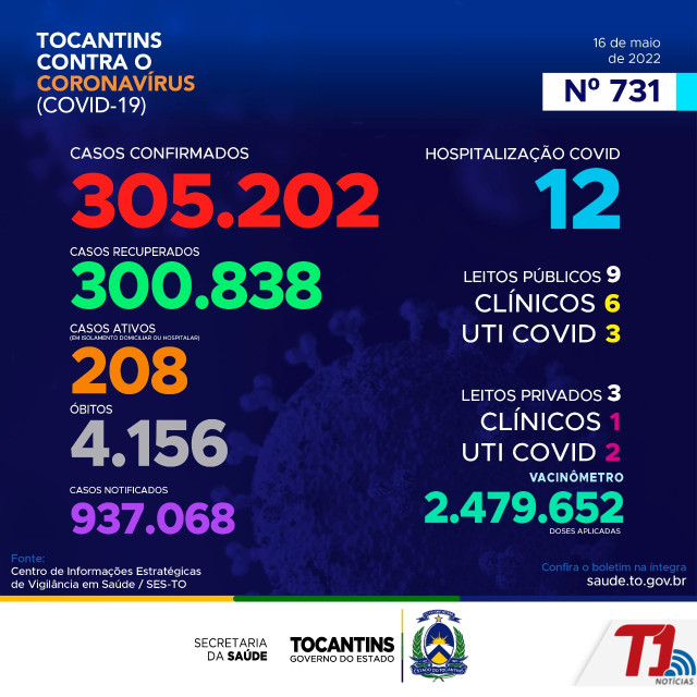 O boletim epidemiológico nº 731 informa que 12 pessoas estão hospitalizadas no Tocantins. Deste total, 9 estão em leitos públicos, sendo 6 em leitos clínicos e outros 3 em UTIs Covid. Já nos leitos privados, são 1 em clínicos e 2 em UTIs Covid, totalizando 3.