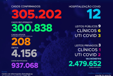 Com os novos dados, atualmente o Estado contabiliza 937.068 pessoas notificadas com a Covid-19 e acumula 305.202 casos confirmados. Destes 300.838 estão recuperados, 208 pacientes seguem em isolamento domiciliar ou hospitalar e 4.156 foram a óbito.