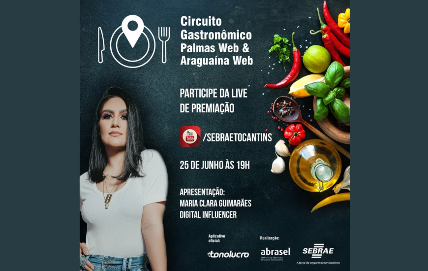 Os vencedores das premiações “Prato Nota 10”, “Prato Mais Vendido” e “Cliente Mais Guloso” do Circuito Gastronômico Palmas e Araguaína Web serão apresentados nesta quinta-feira, 25. A live de premiação será apresentada pela digital influencer, Maria Clara Guimarães e contará com a participação do cantor Marcelo Bahia.
