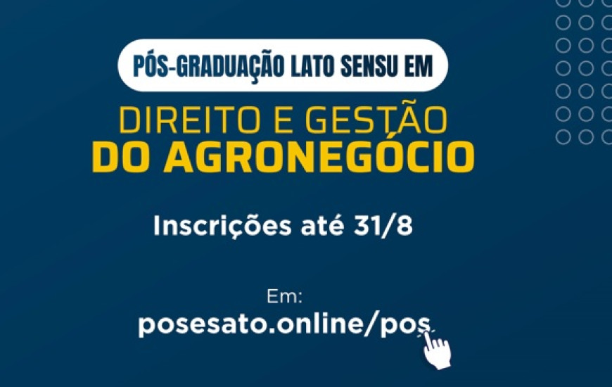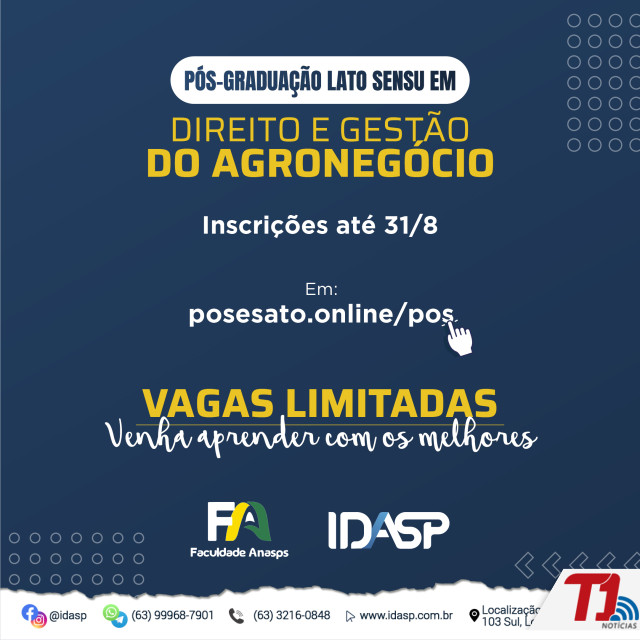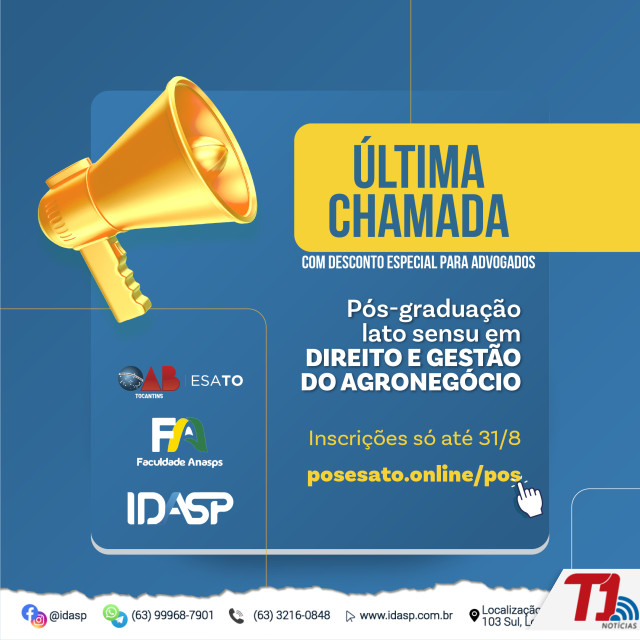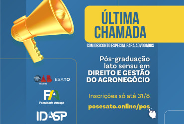 Resultado de uma parceria entre a Ordem dos Advogados do Brasil, seccional Tocantins (OAB-TO), a faculdade Anasps e o Instituto de Direito Aplicado ao Setor Público (Idasp), o curso de pós-graduação em Direito do Agronegócio tem desconto especial para advogados filiados à OAB-TO. O valor fixo da mensalidade é de R$ 125,00. As inscrições se encerram nesta quarta-feira, 31, e podem ser feitas neste link.