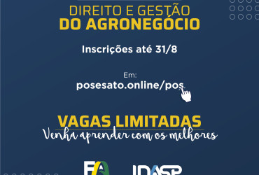 O Idasp e a Faculdade Anasps têm expertise em capacitação voltada para o Direito. Assim também é na pós-graduação do Direito do Agronegócio. Entre as disciplinas, estão: Direito Empresarial; Direito Tributário;Direito Processual; Negócio jurídico e Direito notarial; Fundamentos do Direito do Agronegócio; Regularização Fundiária e o Agronegócio; Transação Imobiliária Rural e Direito Registral; Direito Ambiental; Direito Processual e resolução de conflitos; Direito e relações de trabalho no agronegócio e Financiamento Rural e Seguro.