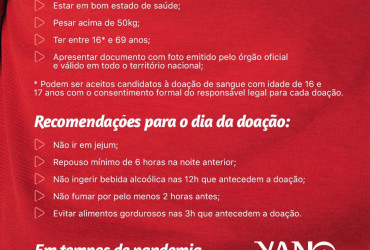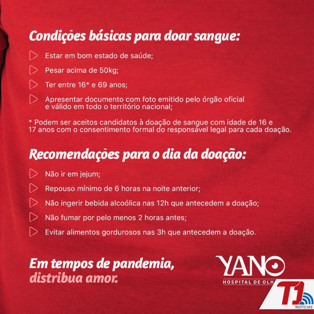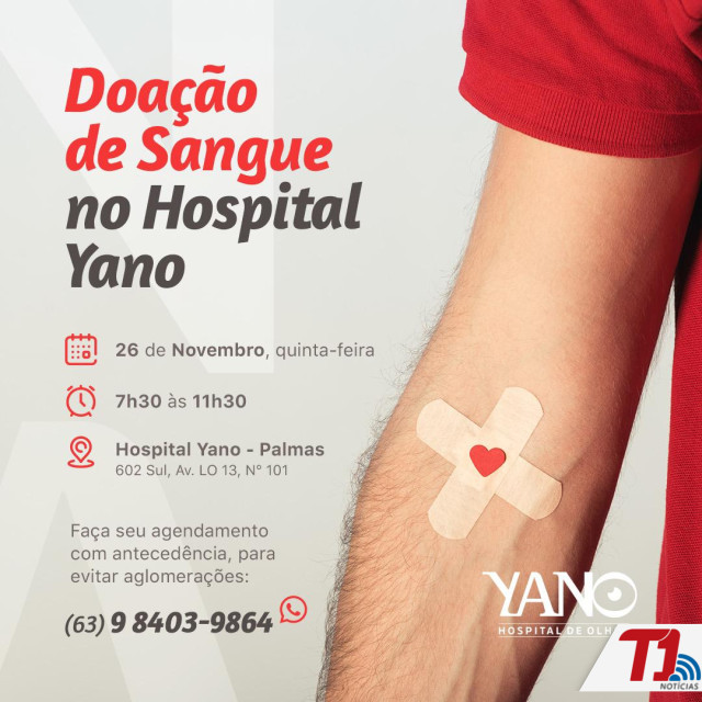 A unidade Móvel do Hemocentro estará no dia 26 de novembro, quinta-feira pela manhã no Hospital de Olhos Yano para receber as doações de sangue. Para que não tenha aglomerações, as doações podem ser agendadas com antecedência via whatsapp pelo número 94403 9864. Todas as informações também estão sendo divulgadas pelo perfil @hospitalyano no instagram.
