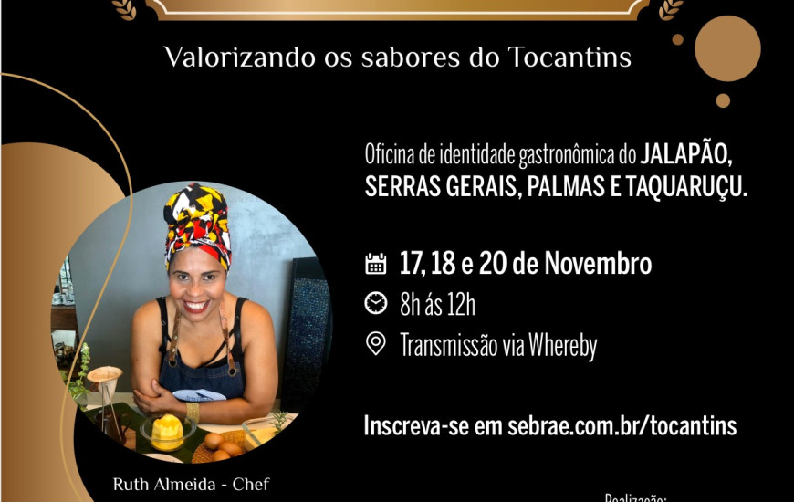A Cozinha Show “Sabor que toca” será realizada nos dias 17, 18 e 20 de novembro pelo Sebrae Tocantins, com oficinas transmitidas gratuitamente pela plataforma Wherebytem. O evento tem como objetivo valorizar e reforçar a identidade gastronômica tocantinense, por meio da preparação de pratos da culinária regional. Para participar, os interessados podem se inscrever pelo Portal de Serviços do Sebrae, clicando em curso e eventos.
