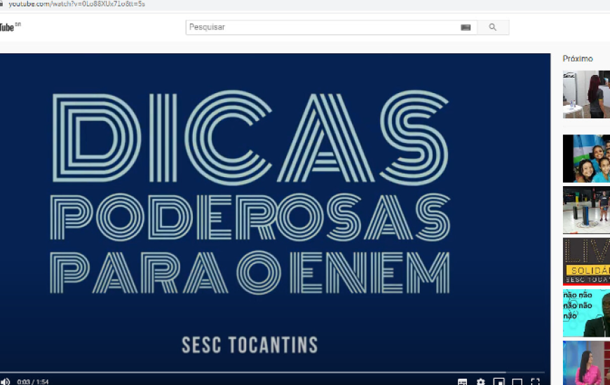 Como forma de auxiliar todos os estudantes que estão se preparando para as provas do Exame Nacional do Ensino Médio (Enem), o Cursinho Pré-Vestibular do Centro de Atividades de Palmas, que fica na 502 Norte, está disponibilizando vídeos com dicas especiais para os candidatos obterem êxito no Exame. As ‘Dicas Poderosas para o Enem’ começaram a ser veiculadas no último dia 04 de agosto no canal do Sesc Tocantins no YouTube, e serão postadas sempre às 15h de segunda a sexta-feira, exceto aos feriados. Mais informações pelo telefone (63) 3212-9943.