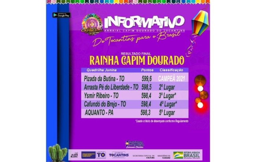 O Arraial Capim Dourado terminou no último sábado, 26, com o anúncio dos grandes campeões de 2021. O evento movimentou as quadrilhas juninas do Tocantins e de alguns estados do Brasil.