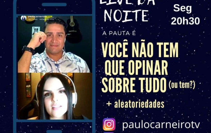 Com o tema "Você não tem que se posicionar sobre tudo", os jornalistas Paulo Carneiro e Cléo Oliveira realizam nesta segunda-feira, 22, às 20h30, a segunda edição do projeto "Live da Noite". A proposta é aproveitar o grande fluxo de pessoas conectadas às redes sociais desde as medidas de isolamento social para abordar temas ao vivo com a participação de quem assiste.