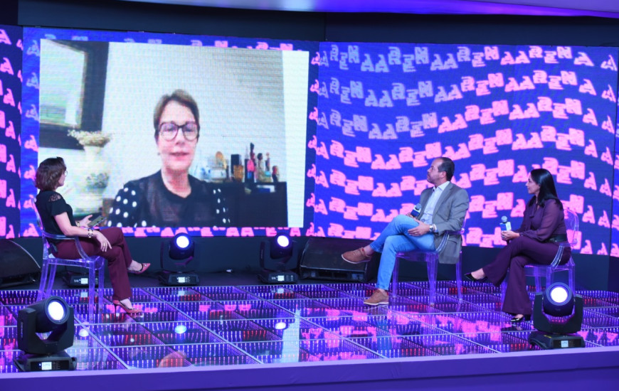 A Ministra da Agricultura, Tereza Cristina Corrêa, fez participação especial no dia voltado ao agronegócio na Arena do Conhecimento. Em clima descontraído, conversou com o superintende do Sebrae Tocantins, Moisés Gomes, e a diretora técnica, Eliana Castro. Agradeceu o convite por fazer parte de momento tão ímpar de qualificação e parabenizou o Sebrae Tocantins por ser o diferencial nos pequenos negócios do Estado.