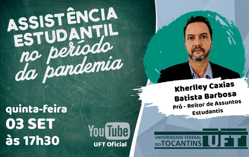 A Universidade Federal do Tocantins (UFT) realizará live nesta quinta-feira, 03, às 17h30 no canal oficial da Universidade no youtube. A live será conduzida pelo pró-reitor de Assistência Estudantil, Kherlley Barbosa.