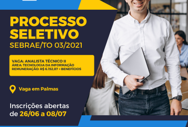 O Sebrae Tocantins abriu processo seletivo para uma vaga de analista II, na área de Tecnologia da Informação. Com salário de R$ 6.152,87, mais benefícios, interessados devem se inscrever, até dia 8 de julho, no link.