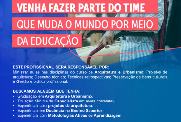 Para participar do processo seletivo, o candidato deverá atender alguns requisitos, bem como, possuir Graduação em Arquitetura e Urbanismo, Titulação Mínima de Especialista em áreas correlatas, experiência com projetos de arquitetura, em Docência no Ensino Superior e Metodologias Ativas de Aprendizagem.