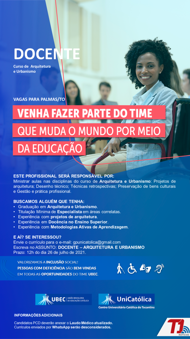 O Centro Universitário Católica do Tocantins (UniCatólica) está com seleção aberta para contratação de docente para o curso de Arquitetura e Urbanismo. O profissional selecionado será responsável por ministrar aulas nas seguintes disciplinas do curso: Projetos de arquitetura; Desenho técnico; Técnicas retrospectivas; Preservação de bens culturais e Gestão e prática profissional.