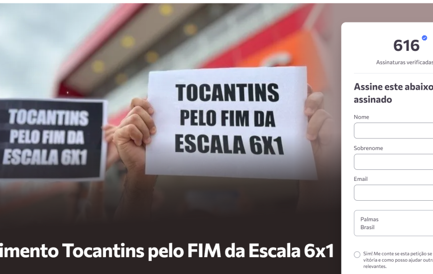 O “Movimento Tocantins pelo Fim da Escala 6x1”, lançado pelo Coletivo Somos, alcançou mais de 600 assinaturas em um abaixo-assinado online. A iniciativa busca mobilizar a sociedade em defesa da redução da jornada de trabalho para o modelo 5x2, com dois dias de descanso semanal, sem perda de renda.