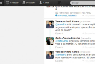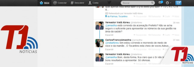 O prefeito Carlos Amastha e o vereador da oposição Iratã Abreu trocaram farpas na rede social Twitter na tarde desta segunda-feira, 23. O mal estar começou quando o vereador respondeu um post de Amastha, feito no sábado, 21. “Alguém assistiu o tremendo mico do dito vereador da oposição na reportagem? Velha técnica da família. Coletivas para denegrir. Não deu certo”, tuitou o prefeito.