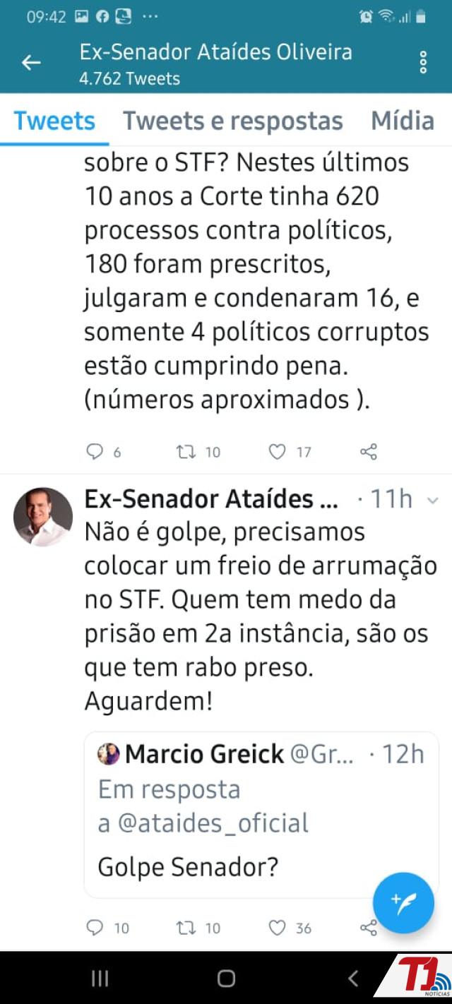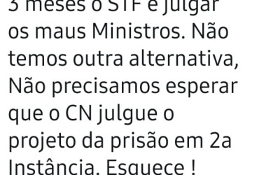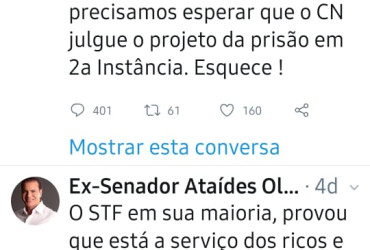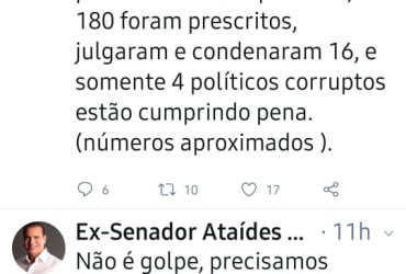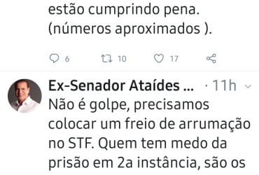 Respondendo um internauta, Ataídes afirma que o seu pedido não é golpe. “Precisamos colocar um freio de arrumação no STF. Quem tem medo da prisão em 2ª instância são os que têm rabo preso. Aguardem!”, expressou.