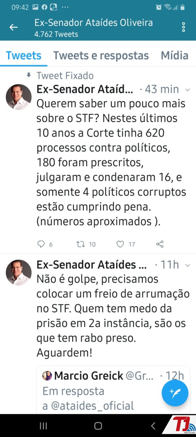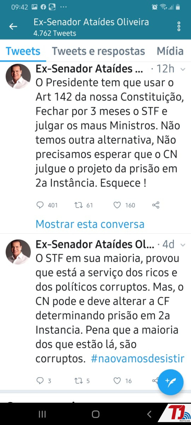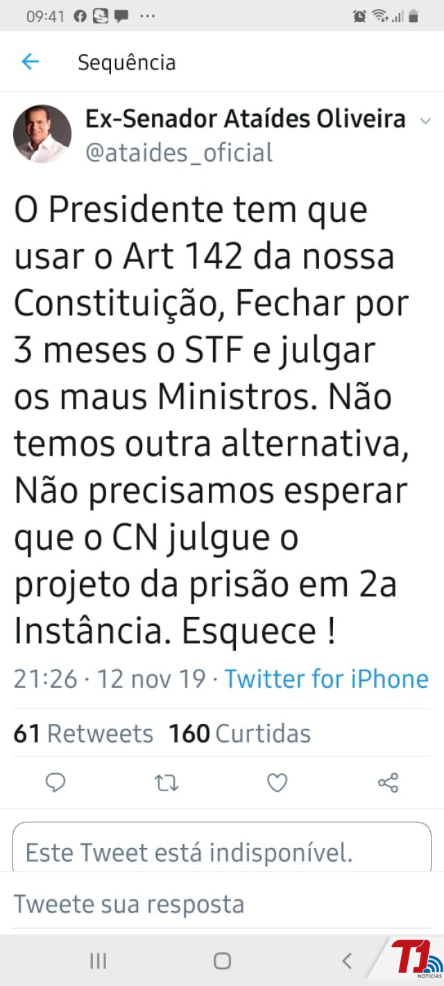 Em postagens polêmicas no Twitter, na noite desta terça-feira, 12, o ex-senador da República e presidente do PSDB no Tocantins, Ataídes Oliveira, recomendou claramente ao presidente Jair Bolsonaro (PSL) que feche o Supremo Tribunal Federal (STF) após o mesmo cumprir a Constituição em relação a prisão em segunda instância. Conforme uma das publicações, o ex-parlamentar diz que é necessário fechar o STF por três meses para “julgar os maus ministros”.