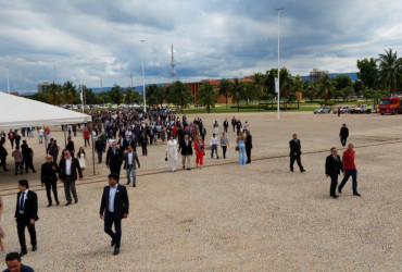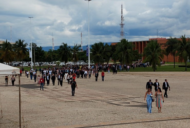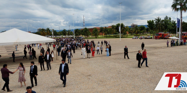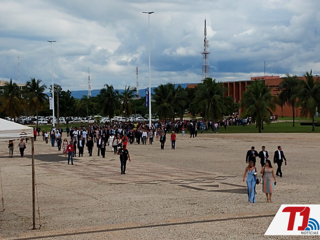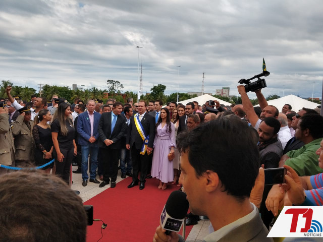 deputados estaduais, federais, senadores, a imprensa e convidados para realizar o deslocamento, na Praça dos Girassóis, até a cerimônia no Palácio Araguaia, onde ocorre um evento aberto na entrada da sede do governo estadual.