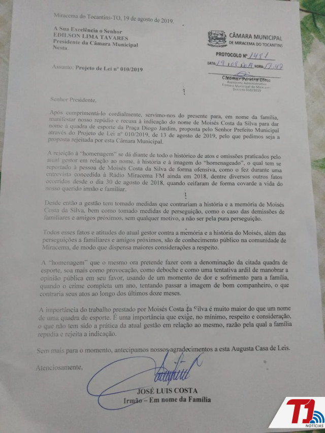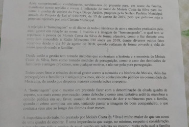 Já no documento protocolado na Câmara, os parentes de Moisés dizem que “a rejeição a ‘homenagem’ se dá diante de todo o histórico de atos e omissões praticados pelo atual gestor em relação ao nome, à história e à imagem do ‘homenageado’, o qual tem se reportado à pessoa de Moises Costa da Silva de forma ofensiva, como o fez durante uma entrevista concedida à Rádio Miracema FM em 2018, dentre diversos outros fatos ocorridos desde o dia 30 de agosto de 2018”.