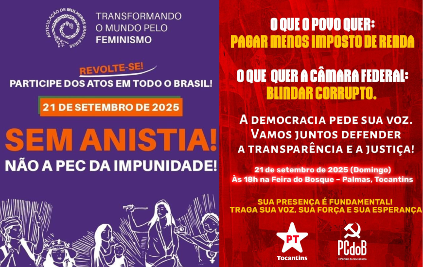 Partidos de esquerda, entre eles o PT, PCdoB Rede e Psol, além de entidades representativas de mulheres e trabalhadores, protestam neste domingo, 21, na Feira do Bosque, em Palmas, contra a anistia e a PEC da Blindagem, também conhecida como PEC da Bandidagem e exigir da Câmara Federal que paute projetos para a população, como a isenção do imposto de renda para quem ganha até R$ 7,3 mil.