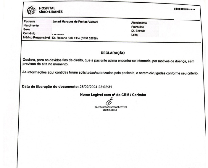 Falando com tranquilidade e bem humorada, a deputada Janad Valcari(PL), entrou em contato com o T1 Notícias por telefone, direto do Hospital Sírio Libanês onde está internada desde ontem, para tranquilizar familiares, amigos e seguidores. "Mulher, eu tenho enxaqueca desde os 14 anos. Não posso comer um monte de coisa, nada que tenha leite, não posso com pimenta, acho que talvez é a minha alimentação que está agravando essas dores, mas tranquiliza o povo aí, que eu estou bem", disse ela.