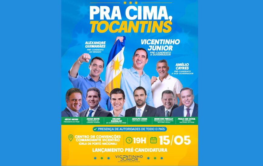 O PSDB (Partido da Social Democracia Brasileira) e o MDB (Movimento Democrático Brasileiro) farão no dia 15 de maio, em Porto Nacional, o lançamento oficial das pré-candidaturas de Vicentinho Júnior ao Governo do Estado; de Amélio Cayres a vice-governador e de Alexandre Guimarães ao Senado (MDB). O ato será realizado no Centro de Convenções Vicente de Paula Oliveira – Comandante Vicentão.