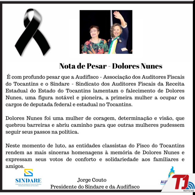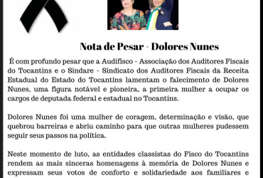 O Ministério Público do Tocantins (MPTO) manifesta pesar pelo falecimento de Dolores Nunes, liderança política que deixa um legado para o Estado do Tocantins e para a cidade de Gurupi em especial, registrado em suas passagens pelos cargos de deputada estadual e federal, vice-prefeita de Gurupi e secretária estadual do Trabalho e Desenvolvimento Social.