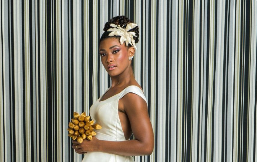 'O Outro Lado do Paraíso': A juíza Raquel (Erika Januza) usa vestido tradicional em casamento com o delegado Bruno (Caio Paduan). A noiva usou maquiagem leve, flor de tecido presa no cabelo penteado em coque e um lindíssimo buquê feito de capim dourado.