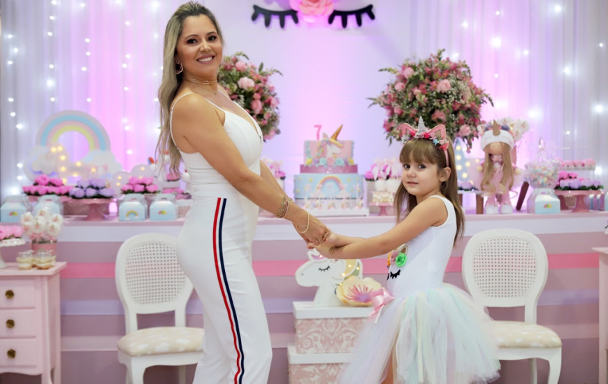 No salão do castelo no reino dos unicórnios, a caçula da família aguardava os convidados para o seu baile comemorativo de sete anos. Lara Patrícia Rodrigues abriu as portas do palácio e recebeu as amiguinhas
