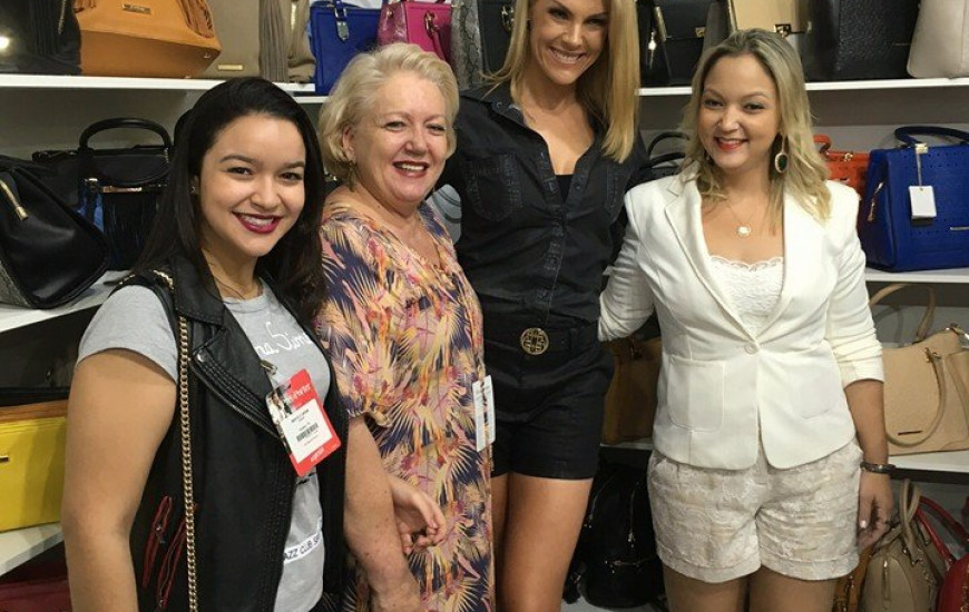 A empresária Silvia Ribeiro, Lorena e Marcela Ribeiro ao lado de apresentadora Ana Hickmann durante a Couro Moda 2016.