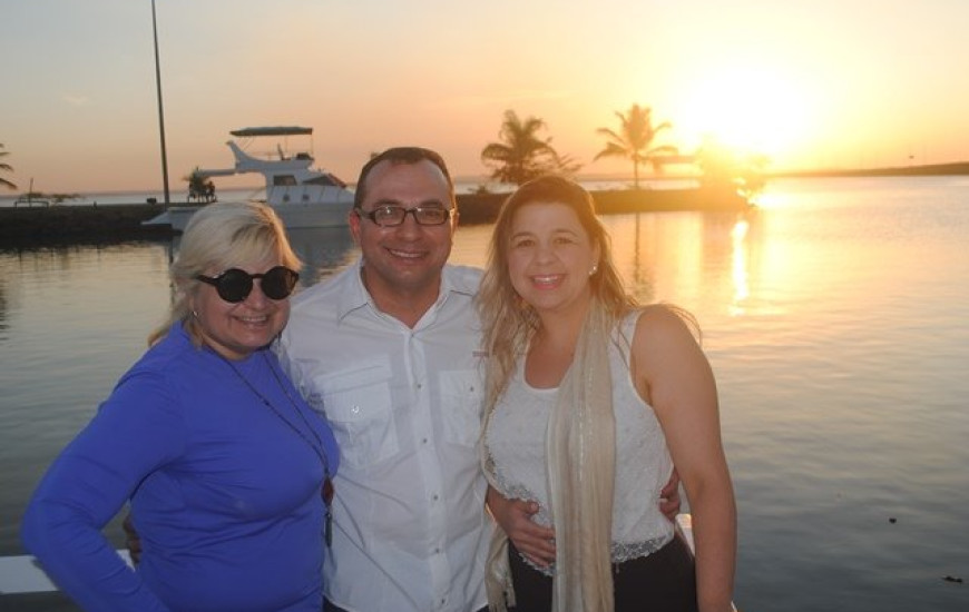 Colunistas sociais Jaciara Barros e Aurielly Painkow e o jornalista Mateus Junior durante passeio com o Ministro do Turismo, Vinícius Nobre Lages.