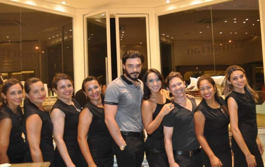 O ator Kiko Pissolato durante inauguração da MMartan Palmas. Na foto com a empresária Grazielly Oliveira e equipe.