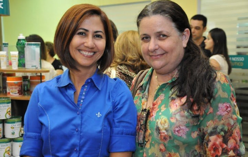 Durante a inauguração da Farmácia Artesanal Palmas, as amigas Tessa Freitas e Claudia Costa colocando o papo em dia.