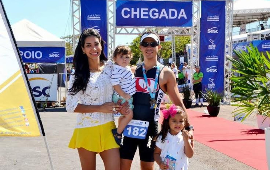 Marcelo Machado sendo prestigiado pela esposa Adriana C. Barbosa Machado e dos filhos João Marcelo e Maria Eduarda durante o Sesc Triathlon Circuito Nacional.