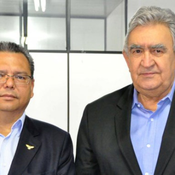 O secretário de Justiça e Direitos Humanos, Nilomar dos Santos Faria e o presidente do Sistema Fecomércio Sesc/Senac, Hugo de Carvalho, em evento que as duas instituições assinaram convênio.