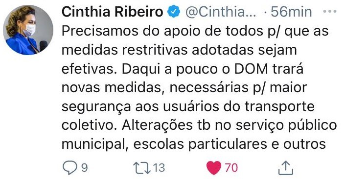 Pouco antes da publicação no Diário Oficial, a prefeita declarou em seu Twitter: